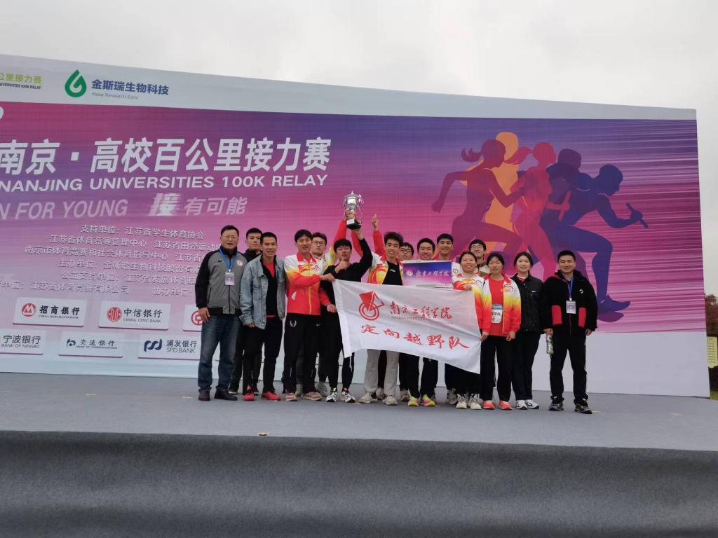 11月13日,由江苏省学生体育协会、江苏省体育产业集团、江苏省发展体育基金会、江苏省田径运动协会支持,金斯瑞生物科技股份有限公司主办的南京高校百公里接力赛在南京牛首山举行,我校定向越野队在体育部濮天伟、李海珍、邓丰三位老师的带领与指导下,运动健儿们团结一心、奋力拼搏,最终10名队员以3小时24分的优异成绩跑完全程,摘获团体亚军,南京大学、江苏大学分获团体冠军和季军。
