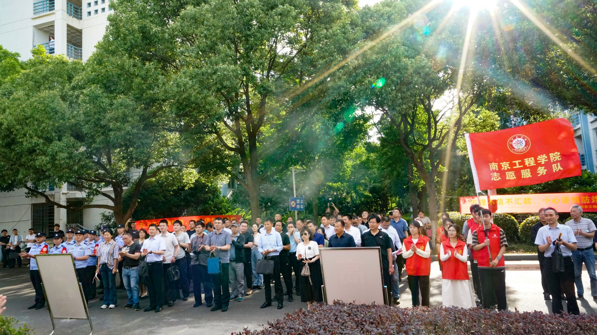 5月29日下午,我校举行校园警务室揭牌仪式。省公安厅内保总队总队长赵居伦,市公安局副局长嵇艳霞,市公安局副局长、江宁区副区长、公安分局局长梅中亚,我校党委书记孙爱武出席仪式并为警务室揭牌。省公安厅内保总队,市公安局内保支队、人口支队,市各区公安分局领导、内保领导,驻宁各高校保卫处领导以及师生代表参与活动。仪式由党委常委、组织部部长、统战部部长聂邦军主持。