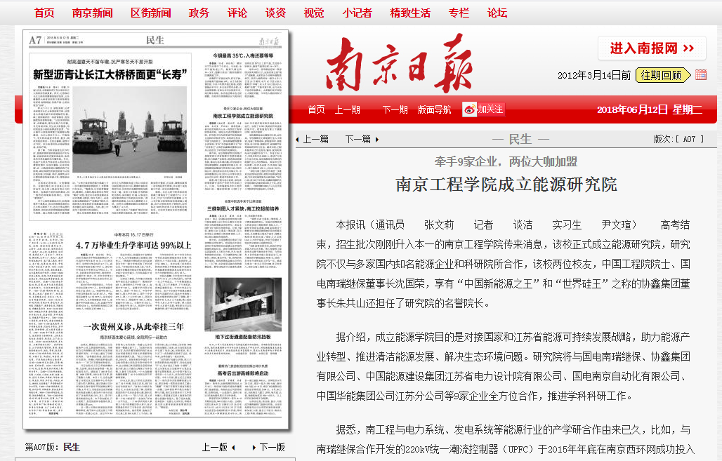 据悉,南工程与电力系统、发电系统等能源行业的产学研合作由来已久,比如,与南瑞继保合作开发的220kV统一潮流控制器(UPFC)于2015年年底在南京西环网成功投入运行,实现了UPFC换流站所有设备的国产化,使我国成为第三个掌握UPFC技术的国家。