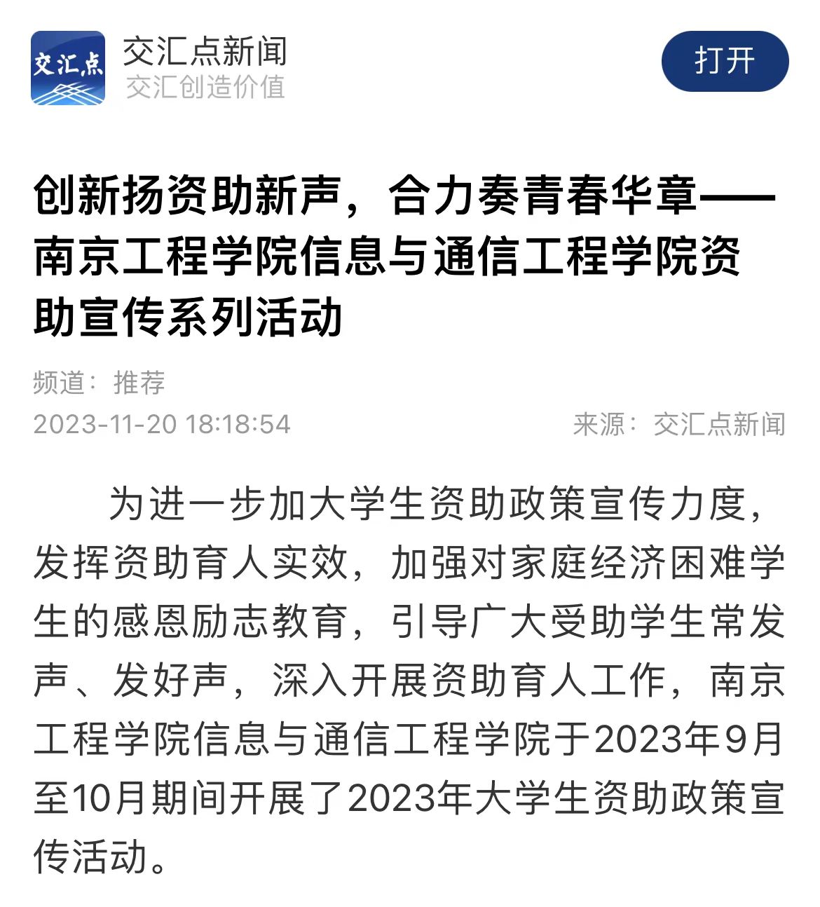 为进一步加大学生资助政策宣传力度,发挥资助育人实效,加强对家庭经济困难学生的感恩励志教育,引导广大受助学生常发声、发好声,深入开展资助育人工作,凯发k8官网信息与通信凯发于2023年9月至10月期间开展了2023年大学生资助政策宣传活动。