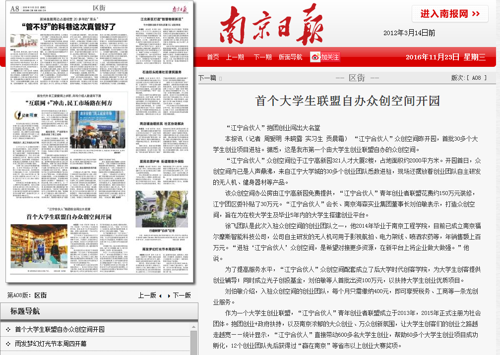 《南京日报》:首个大学生联盟自办众创空间开园