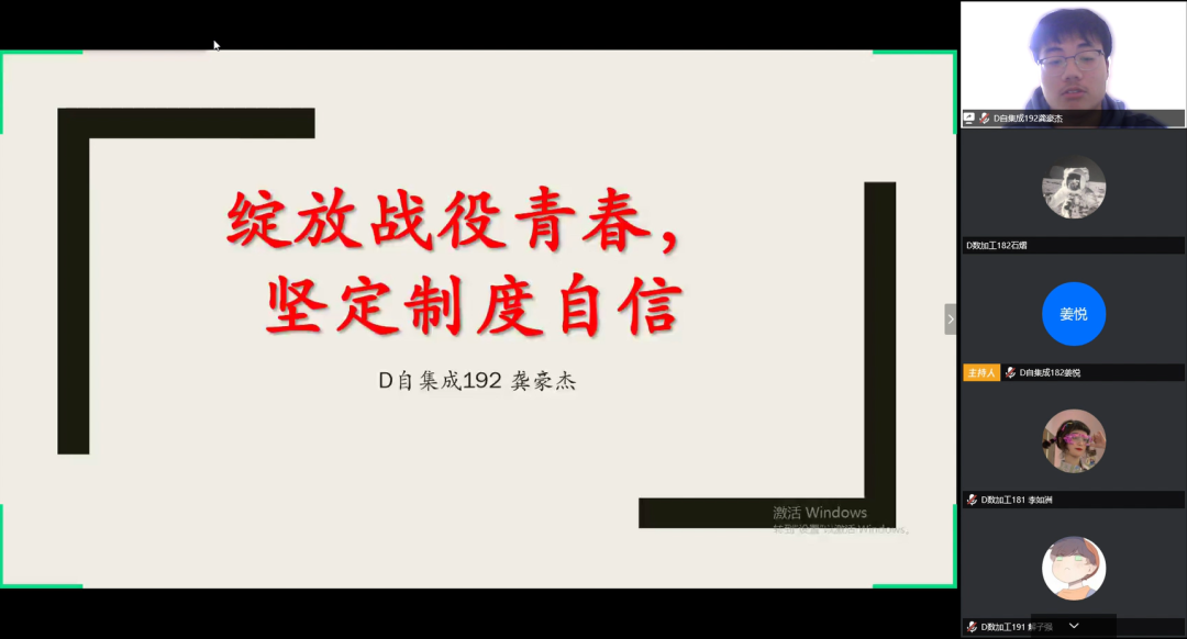 各团支部充分利用“青年大学习”平台,深入学习党中央关于疫情防控工作的最新部署、习近平总书记重要讲话精神,明确了青年在此次疫情中应当扮演的角色,坚定战“疫”必胜信念。同时组织动员同学们利用“钉钉”“学习通”“zoom”等平台召开“云班会”,开展疫情防控知识线上专题学习。除了线上学习辅导、心理陪伴等志愿服务活动外,D自集成182班献唱抗疫公益音乐,D机加工181班召开云视频班会,抒发对未来的憧憬、对英雄的敬佩和对祖国的自豪感。“守住家门,在家也是战士,我们青年积极投身于抗击疫情的一线,尽显远大抱负。”同学们感慨道。