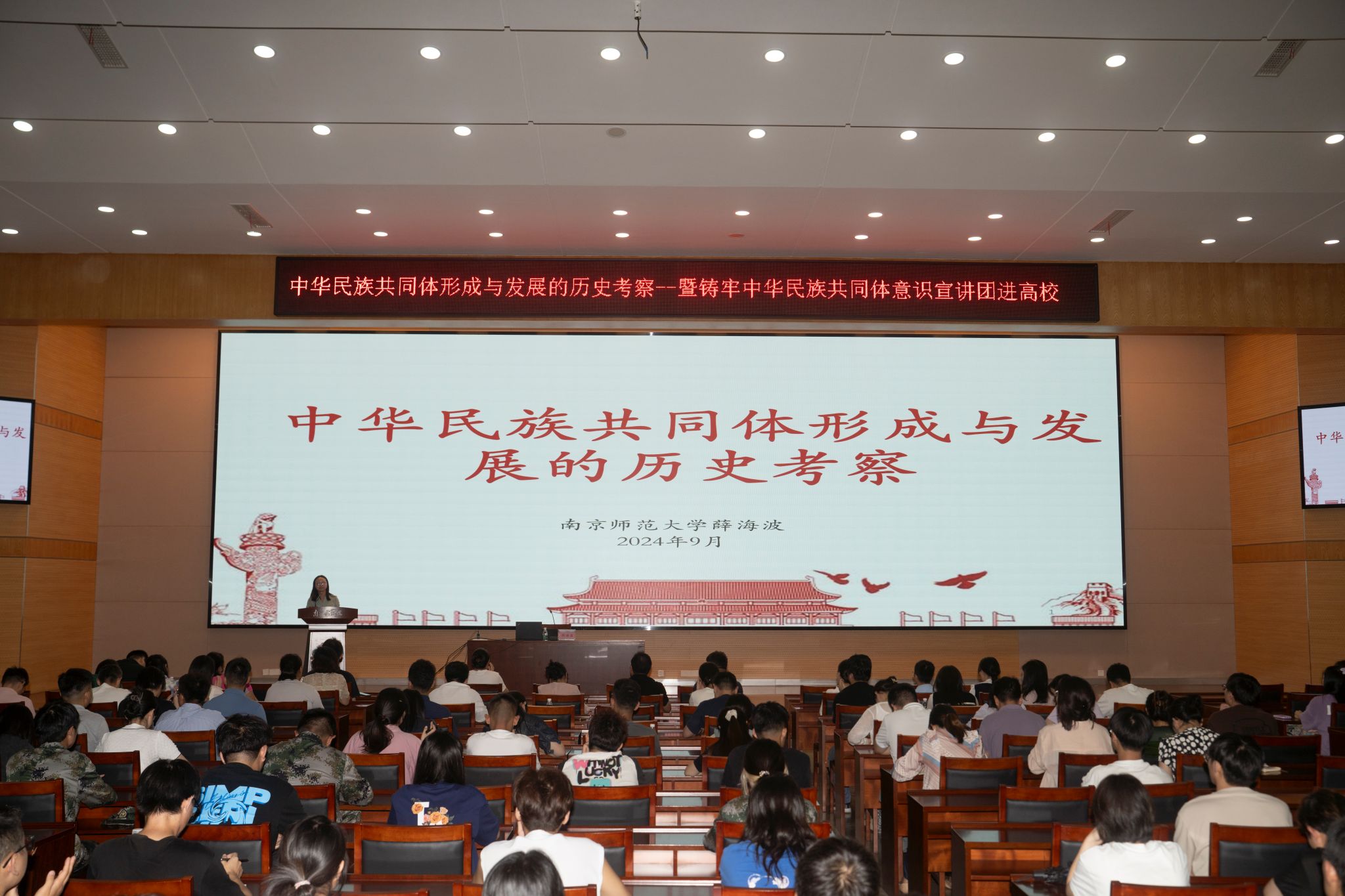 本次宣讲活动邀请到《中华民族共同体概论》参编者之一、南京师范大学社会发展学院历史系教授、博士生导师、国家民委第三批民族研究优秀中青年专家薛海波教授为我校师生作报告。他以“中华民族共同体形成与发展的历史考察”为主题,对“中华民族”“中华民族共同体”和“中华民族共同体意识”基本概念进行了详细解读,并围绕中华民族形成于何时、中华民族作为民族文化共同体的内涵和特征、中华民族共同体在每个历史阶段演进的历史脉络等问题予以细致讲解。宣讲活动在全场热烈的掌声中画上圆满句号,老师和同学们纷纷表示,薛教授的精彩论述是对中华民族共同体形成与发展历史的生动解读,更是对思想的启迪,激发了大家对民族历史文化的深刻理解与崇高敬意,让在座的每一个人都深受教益。