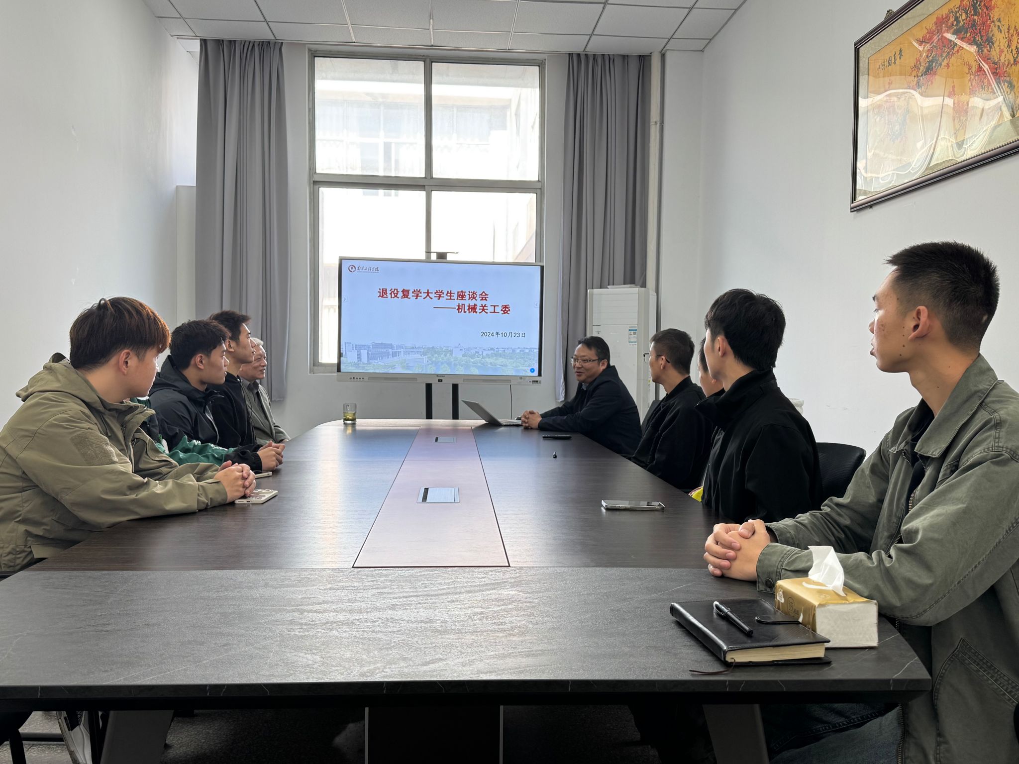 刘树春对同学们回归校园表示欢迎,他肯定了同学们积极投身国防建设的奉献精神,并勉励大家尽快适应新的校园环境,确立新的学习目标,在今后学习生活中保持在部队的优良作风,不断追求进步。他表示学院会帮助大家尽快重新融入校园生活,切实解决在学业、生活等方面遇到的困难,让大家的学习生活没有后顾之忧。何小龙勉励同学们根据自身的实际情况做好学业、生活规划,既要打牢专业理论基础,结合学科竞赛等科创项目加深专业理解,切实提升专业能力,也要关注社会前沿科技,结合兴趣爱好提前做好发展规划,充分发挥主观能动性。